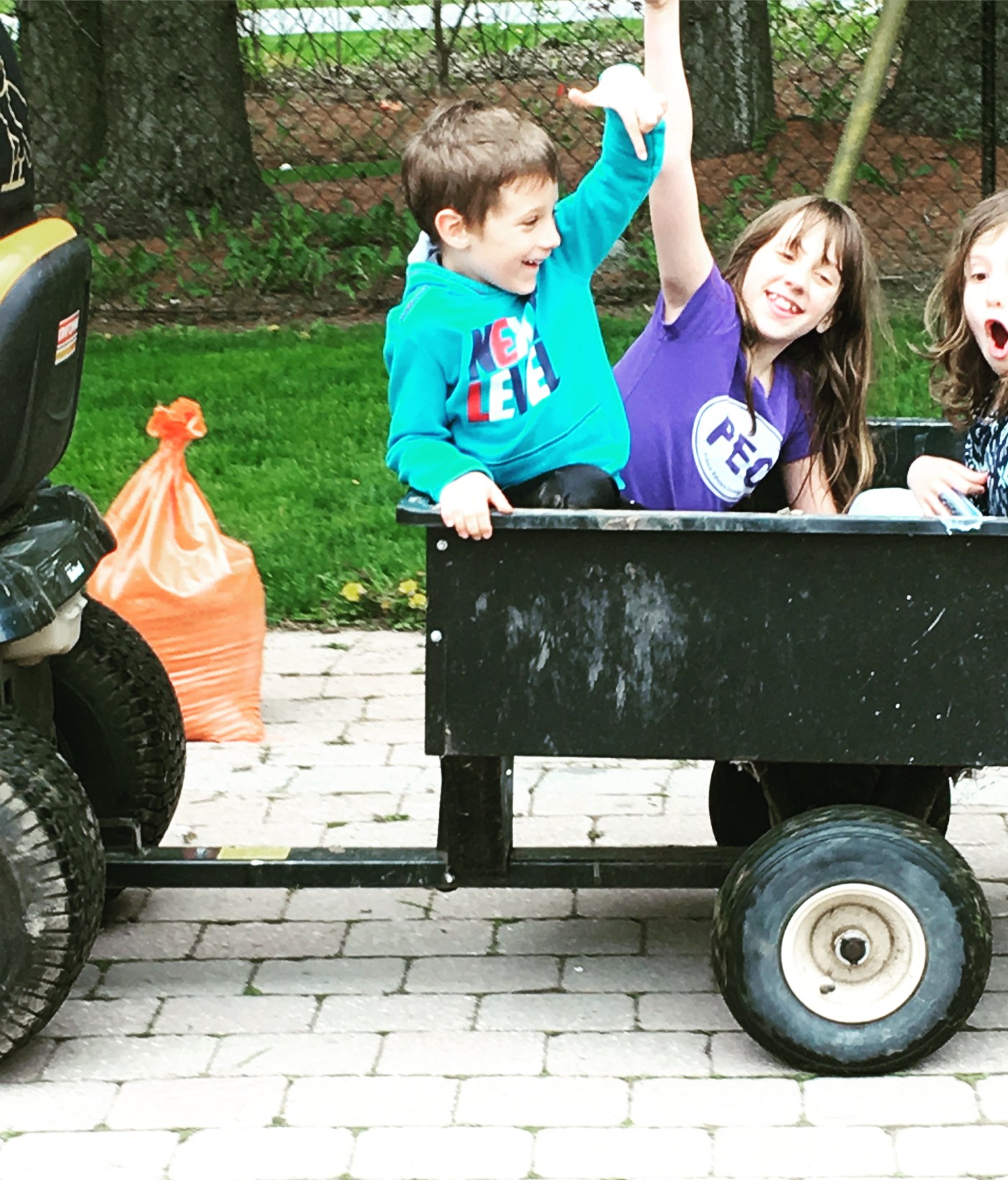 With the most recent reports being that the waters are going to be high for awhile, the expected mid-June receding will probably not happen and we will not be able to assess any damage until it does. PEC is offering sandbags to anyone whose property is at risk and Mr. L borrowed a neighbours tractor and trailer to get the 60 lb bags down to the shoreline to try and protect the boathouse. At least the kids had fun riding around in the trailer!